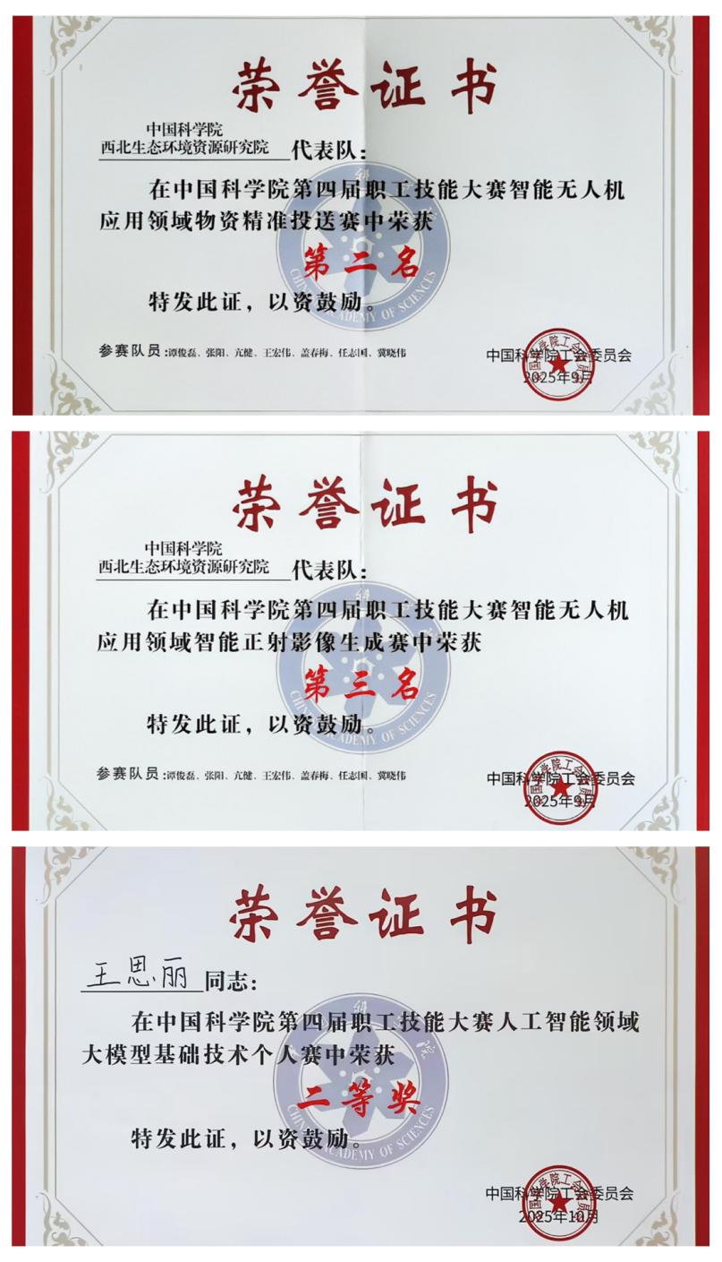 在西北研究院黨委的高度重視與工會(huì)的精心組織下,科研團(tuán)隊(duì)積極響應(yīng)、踴躍參賽。智能無人機(jī)應(yīng)用領(lǐng)域,由黑河遙感試驗(yàn)研究站譚俊磊、亢健、張陽等6名選手組成的團(tuán)隊(duì)通過精準(zhǔn)路徑規(guī)劃與動(dòng)態(tài)負(fù)載調(diào)控,實(shí)現(xiàn)復(fù)雜環(huán)境下物資的穩(wěn)定投送,依托自研靶標(biāo)識(shí)別程序,顯著提升正射影像數(shù)據(jù)處理效率,榮獲了“物資精準(zhǔn)投送”賽道全院第二名,“智能正射影像生成”賽道全院第三名和團(tuán)隊(duì)三等獎(jiǎng)。在網(wǎng)信智能應(yīng)用服務(wù)領(lǐng)域,國家冰川凍土沙漠科學(xué)數(shù)據(jù)中心團(tuán)隊(duì)將專業(yè)領(lǐng)域數(shù)據(jù)和服務(wù)能力與AI的強(qiáng)大分析推理能力結(jié)合,實(shí)現(xiàn)自然語言交互、數(shù)據(jù)智能分析和可視化展示,提升了數(shù)據(jù)中心的智能化服務(wù)水平,榮獲了“MCP云服務(wù)”賽道三等獎(jiǎng)。在人工智能領(lǐng)域,文獻(xiàn)情報(bào)中心王思麗基于中國科學(xué)院 “磐石?科學(xué)基礎(chǔ)大模型”,圍繞人工智能基礎(chǔ)理論、實(shí)操能力與知識(shí)融合推理能力展開角逐,榮獲“大模型基礎(chǔ)技術(shù)個(gè)人賽”二等獎(jiǎng)。