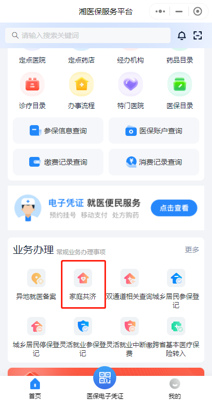 第一步:下載“湘醫(yī)?!盇pp,或進(jìn)入“湘醫(yī)?!盇pp小程序,登錄后在首頁“業(yè)務(wù)辦理”中找到“家庭共濟(jì)”,點(diǎn)擊“共濟(jì)申請(qǐng)”。