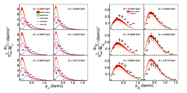 在本項(xiàng)工作中,利用北京譜儀BESIII數(shù)據(jù),團(tuán)隊(duì)精確測(cè)量了中性pion和Kaon介子單舉產(chǎn)生微分截面,最高精度達(dá)4%, 僅為現(xiàn)有實(shí)驗(yàn)數(shù)據(jù)誤差的五分之一?;诂F(xiàn)有一系列碎裂函數(shù)的理論計(jì)算均不能很好地描述實(shí)驗(yàn)結(jié)果。因此,該能區(qū)的實(shí)驗(yàn)測(cè)量為碎裂函數(shù)及強(qiáng)子化過程的研究提供了精確的實(shí)驗(yàn)數(shù)據(jù)。