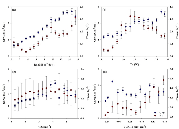 圖2 梭梭人工林碳(GPP)和水(ET)通量對(duì)環(huán)境因子(凈輻射Rn、氣溫Ta、風(fēng)速WS和10cm深度土壤含水量VWC10)的響應(yīng)過程