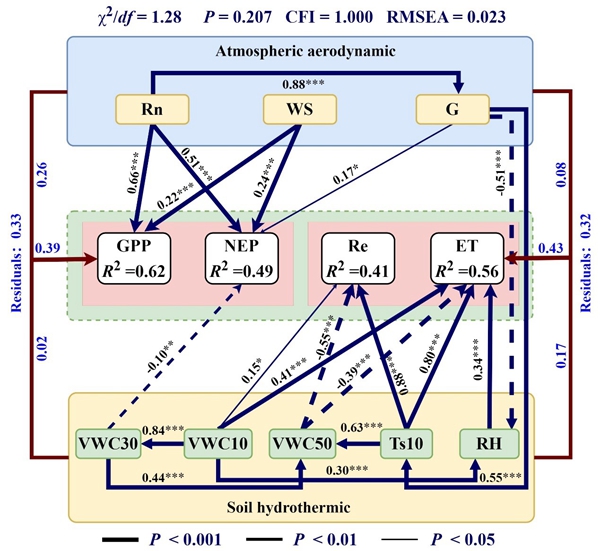 圖3 結(jié)構(gòu)方程模型所揭示梭梭人工林碳水通量與環(huán)境因子的關(guān)系