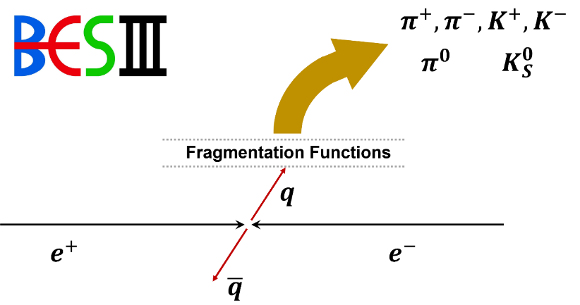 標準模型的量子色動力學(QCD)是描述部分子(夸克和膠子)間強相互作用的理論,它的最大挑戰(zhàn)來自于低能區(qū)的非微擾性質。由于色禁閉效應,實驗上無法直接觀測到帶色荷的部分子,只能探測色中性的強子。碎裂函數(shù)描述了部分子的強子化過程,對其研究是理解強子產(chǎn)生機制的重要手段。正負電子對撞中單舉強子的產(chǎn)生被認為是研究碎裂函數(shù)最有效的過程之一(如圖1所示)。目前,在質心能量低于10 GeV的區(qū)域,能用于碎裂函數(shù)研究的高精度正負電子對撞實驗數(shù)據(jù)極為有限。