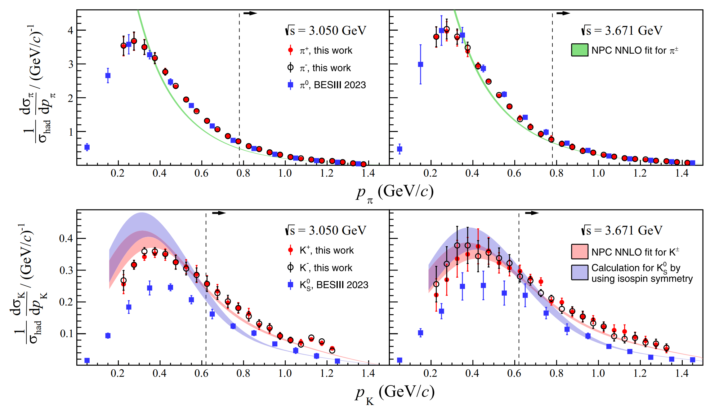 面對這一挑戰(zhàn),團隊利用北京譜儀(BESIII)能量掃描數(shù)據(jù),精確測量了帶電pion和Kaon介子單舉產(chǎn)生微分截面,最高精度達1%~2%。結合NPC合作組(Non-perturbative Physics Collaboration)的全局數(shù)據(jù)擬合研究,這一新的測量結果與基于次次領頭階(NNLO)精度的量子色動力學(QCD)理論分析相符合,尤其是大動量強子區(qū)域(如圖2所示)。該研究成果為檢驗低能區(qū)QCD因子化定理及部分子碎裂過程中同位旋對稱性的有效性提供了有力的實驗支持,對深入理解強相互作用動力學具有重要意義。