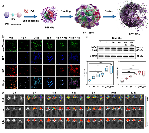 團(tuán)隊(duì)進(jìn)一步探索溶酶體功能變化與Aβ蛋白相分離之間的關(guān)系。通過ATRP合成pH響應(yīng)骨架,將AIE染料四苯乙烯(TPE)共價(jià)接枝,并自組裝包載近紅外ACQ染料吲哚菁綠(ICG),形成AIE/ACQ協(xié)同的比率成像納米結(jié)構(gòu)探針(PTI),實(shí)現(xiàn)AD自噬溶酶體酸化缺陷及其驅(qū)動的相分離過程的可視化“全流程”監(jiān)測。
