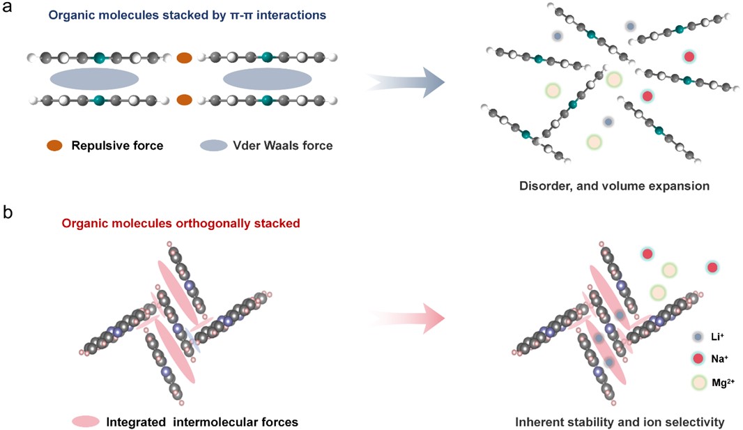 針對(duì)高容量有機(jī)小分子電極因離子插層體積膨脹導(dǎo)致結(jié)構(gòu)坍塌失穩(wěn)的科學(xué)挑戰(zhàn),研究團(tuán)隊(duì)開創(chuàng)性地提出基于分子間作用力網(wǎng)絡(luò)構(gòu)筑穩(wěn)定晶體結(jié)構(gòu)的新思路。以吩嗪為模型體系,研究證實(shí)正交垂直的分子堆疊方式可形成強(qiáng)分子間作用力網(wǎng)絡(luò)和具有離子選擇性的納米孔道。該結(jié)構(gòu)不僅能有效抑制體積膨脹帶來的機(jī)械失效問題,同時(shí)其產(chǎn)生的親鋰孔道在原子尺度對(duì)單價(jià)金屬離子(Li)具有優(yōu)先傳輸與選擇性性能,選擇性提鋰容量高達(dá)109 mg/g。該工作原創(chuàng)性地揭示了分子堆疊微結(jié)構(gòu)與電極材料的宏觀電化學(xué)穩(wěn)定性和離子選擇性之間的內(nèi)在物理化學(xué)規(guī)律,為設(shè)計(jì)新一代兼具高穩(wěn)定性、高選擇性、高通量的有機(jī)電化學(xué)離子捕獲材料奠定了重要理論基礎(chǔ)。