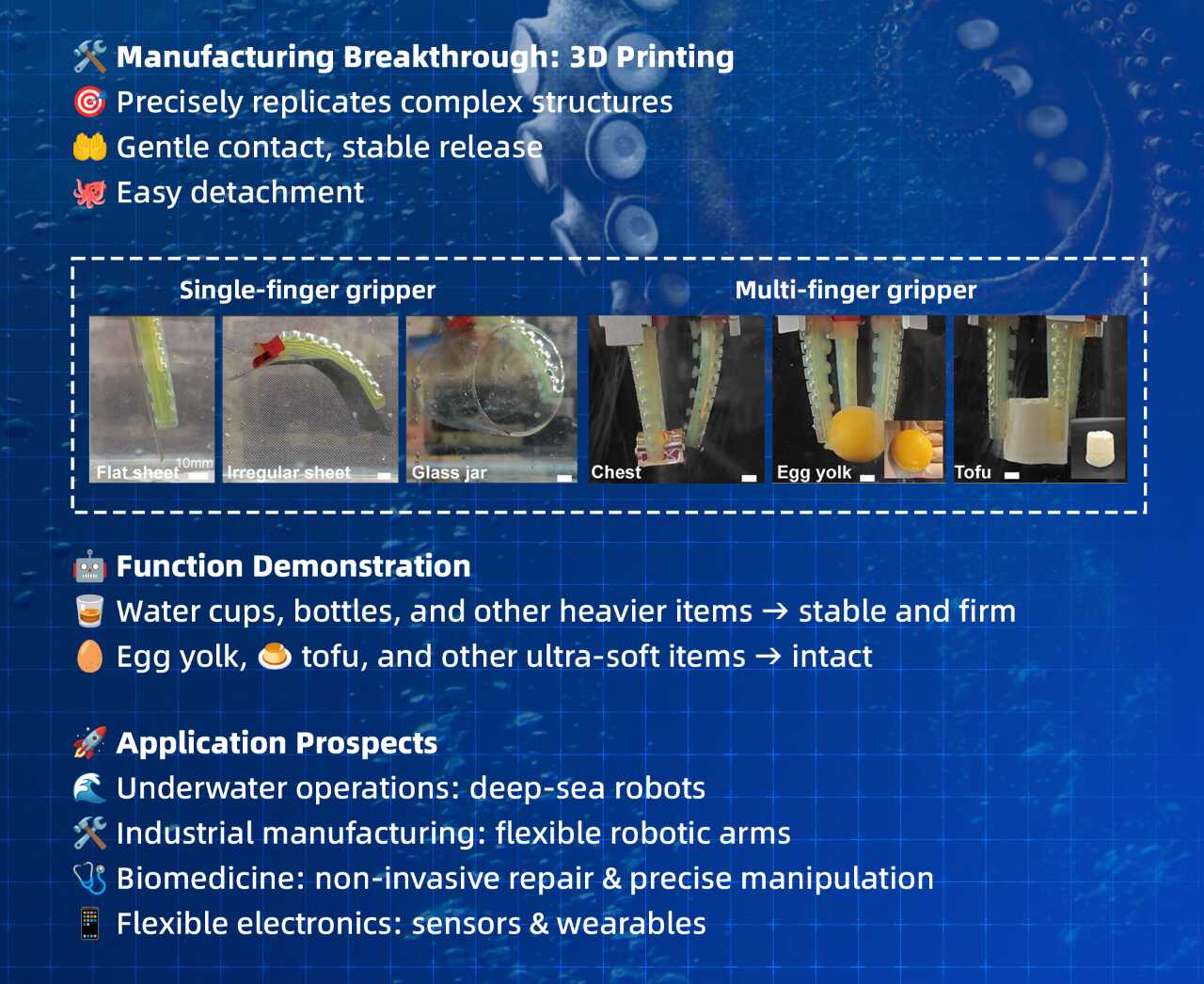 這款仿生吸盤可以裝在機械臂上,穩(wěn)穩(wěn)夾起豆腐、蛋黃等超軟物體而不損傷。它的應用前景廣泛:在深海探測中抓取脆弱生物樣本,在醫(yī)療領(lǐng)域用于非侵入性貼附或手術(shù)輔助,在柔性制造中搬運精密零件。